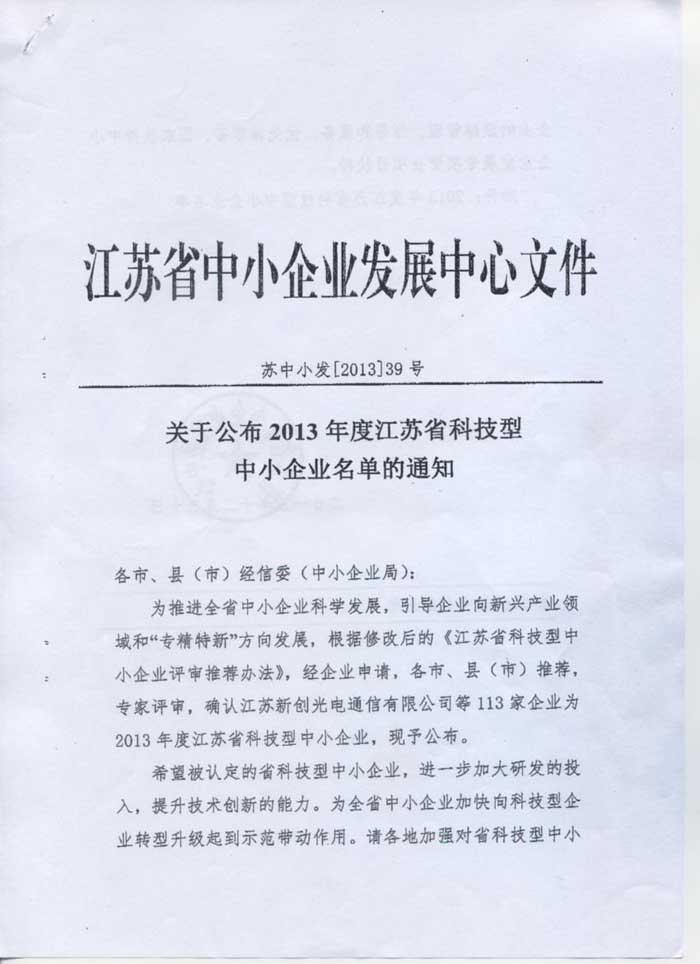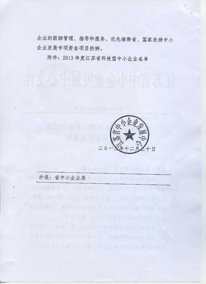 近日,公司通過江蘇省經濟和信息化委員會(省中小企業(yè)局)的評審,被認定為“江蘇省科技型中小企業(yè)”。